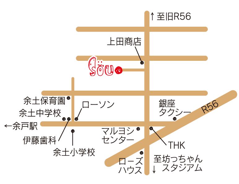 ※スマートフォンからGoogle Mapsで「GenuineSweetsWorks SOU」と検索していただくとかなりわかりやすい地図が表示されます。そのままだとわかりにくい場合は地図上を指で拡大するとより細かく表示されます。自動車のナビですとだいたいの場所しか表示されませんので注意してください。